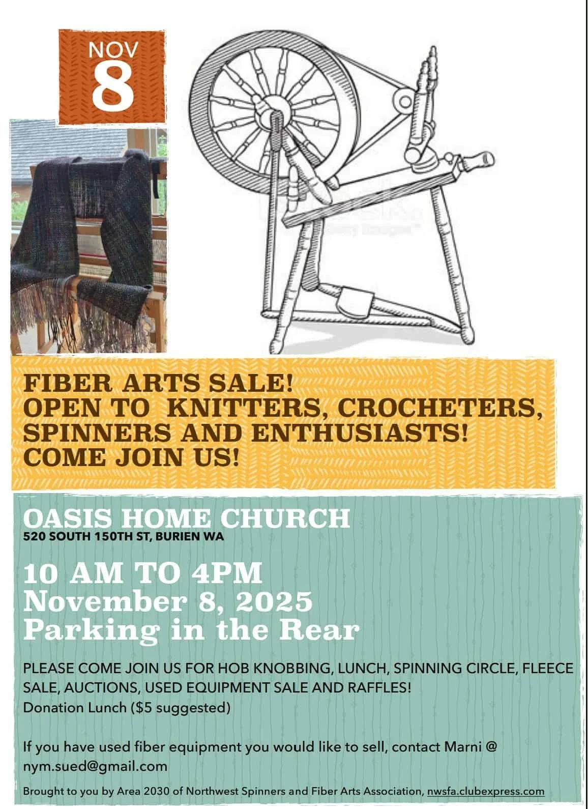 Northwest Spinners & Fiber Arts Association Fiber Arts Sale! Saturday, November 8, 2025 10:00 AM 4:00 PM Oasis Home Church 520 South 150th Street Burien, WA, 98148 (map) Google Calendar ICS